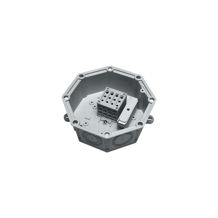 Materials Pull box complete with quadricore multiple terminal strip made of PA6V0 thermoplastic material, protection degree IP20. Pull box body and cover in polyamide thermoplastic material PA6V0+30% glass fiber. Grey RAL 7035 color. Cover with anti losing screws. Thermoplastic rubber seal able to withstand the weather conditions. Characteristics Can be bored in order to install accessories for cable inlet/outlet/shunts such as: pipe/pull box unions; fairleads; tapered fairleads, 4 of which are positioned square to each other at 90° in relation to the perimeter of the pull box or, alternatively, 3 at 45° in the lower part of the box*. Cover with anti losing screws. Applications/Installations For industrial systems, for public lighting, to power distribution panels with uni/multicore cables. For outdoor installation on walls fixed by means of nails or plugs, built into walls or fixed to poles with the fixing bracket (to be ordered separately) in systems with pre-wired overhead cables. Class II version. Protection degree IP 54 in compliance with CEI EN 60529, IK09 according to CEI EN 62262. UPM16/10/V: with sectionable fuse holder for 8.5x31.5 fuse. UPM25/10/V: with sectionable fuse holder for 10.3x38 fuse. *The Octogonal plastic boxes are furnished complete of 3 tapered fairleads.