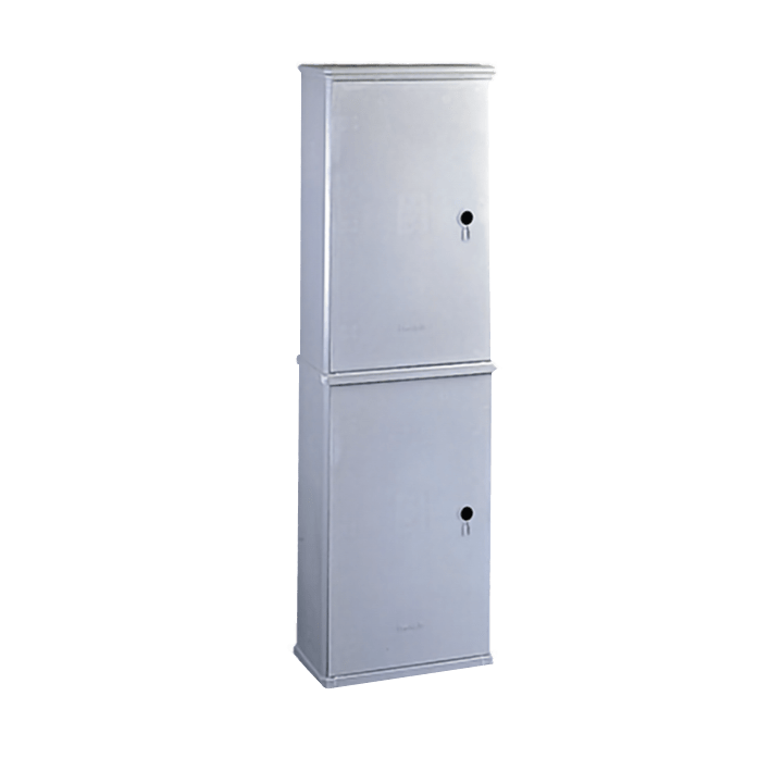 Materials Moulded in SMC (fiberglass) - grey RAL 7040 color. Internal hinges in polyaryla-mide-based fiberglassreinforced thermoplastic resin (IXEF). External metal parts made of stainless steel or tropicalized steel painted grey and electrically insulated from the inside. Fiberglass lock body built into the door. Polyamide resin handle. Lock pivot pin in aluminium alloy. Rods and poles interiors made of steel with 321 GEOMET treatment. Characteristics Cubicle conforming to CEI EN 62208 standard. Rated insulation voltage Ui 690V. Hinged door complete with cremone-type bolt operated by a retracting handle with three-point closing mechanism to ensure that the door adheres perfectly. Handle pre-engineered for profile cylinder to DIN 18252 standards with Y21 individually-keyed safety lock. Air intakes below and under the roof for natural internal ventilation. Bottom wall equipped with inserts embedded molding brass for application equipment directly or through the mounting plate. For self-standing floor installation with anchor frame (to be ordered separately). Products BVT / TP and BVT / T-WLP define the battery supplied on pallets in standard packs of 4 pcs. Refer to the single cubicle forming the compartment when choosing the accessories Protection degree IP 44 in compliance CEI EN 60529, IK 10 according to CEI EN 62262. Standard version complete with lock with retractable lever. WL Version – Without lock and suitable exclusively for use of locks series SCS-SCM.