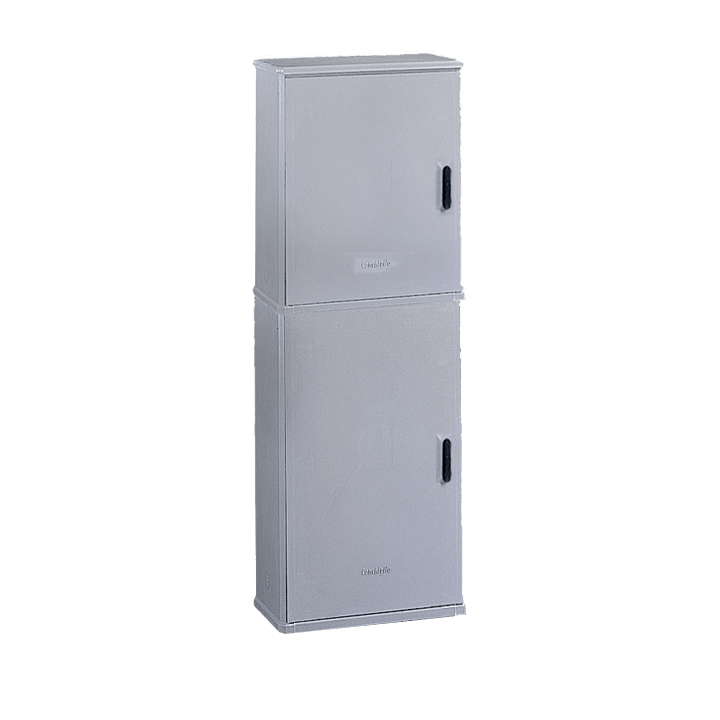 Materials Moulded in SMC (fiberglass) - grey RAL 7040 color. Internal hinges in polyaryla-mide-based fiberglassreinforced thermoplastic resin (IXEF). External metal parts made of stainless steel or tropicalized steel painted grey and electrically insulated from the inside. Fiberglass lock body built into the door. Polyamide resin handle. Lock pivot pin in aluminium alloy. Rods and poles interiors made of steel with 321 GEOMET treatment. Characteristics Cubicle conforming to CEI EN 62208 standard. Rated insulation voltage Ui 690V. Hinged door complete with cremone-type bolt operated by a retracting handle with three-point closing mechanism to ensure that the door adheres perfectly. Handle pre-engineered for profile cylinder to DIN 18252 standards with Y21 individually-keyed safety lock. Air intakes below and under the roof for natural internal ventilation. Bottom wall equipped with inserts embedded molding brass for application equipment directly or through the mounting plate. For self-standing floor installation with anchor frame (to be ordered separately). Products BVT / TP and BVT / T-WLP define the battery supplied on pallets in standard packs of 4 pcs. Refer to the single cubicle forming the compartment when choosing the accessories Protection degree IP 44 in compliance CEI EN 60529, IK 10 according to CEI EN 62262. Standard version complete with lock with retractable lever. WL Version – Without lock and suitable exclusively for use of locks series SCS-SCM.