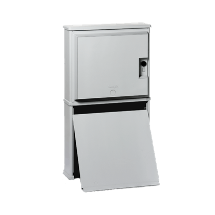 Materials Moulded in SMC (fiberglass) - grey RAL 7040 color. Internal hinges in polyaryla-mide-based fiberglassreinforced thermoplastic resin (IXEF). External metal parts made of stainless steel or tropicalized steel painted grey and electrically insulated from the inside. Fiberglass lock body built into the door. Polyamide resin handle. Lock pivot pin in aluminium alloy. Rods and poles interiors made of steel with 321 GEOMET treatment. Characteristics Conforms to CEI EN 62208 standards. Rated insulation voltage Ui 690V. Hinged door in relief complete with cremone-type bolt operated by a retracting handle with three-point closing mechanism to ensure that the door adheres perfectly. Handle pre-engineered for profile cylinder to DIN 18252 standards with Y21 individually-keyed safety lock. Air intakes below and under the roof for natural internal ventilation. For self-standing floor installation with anchor frame (to be ordered separately). Cubicle supplied on pallet in standard pack containing four pieces. Base for inspection. Protection degree IP 44 in compliance with CEI EN 605299, IK 10 according to CEI EN 62262. The effective dimensions shown in the Table indicate the maximum space available for the equipment in compliance with the features specified by standard CEI EN 62208 (effective protected space).