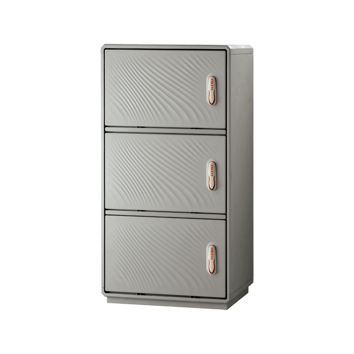 Characteristics Made with 3 equipment compartments separated by an intermediate partition. Rated insulation voltage Ui 690V. Complete with fixing frame for installation on a concrete base. Hinged door complete with closing mechanism operated by a retracting handle and Y21 singlecipher safety lock (DIN18252 profile cylinder - customized cipher on request). Door opening side can be changed on site even on a single compartment (for detailed information consult the accessories selection). Arrangement of the compartments (upper / intermediate / lower) modifiable on site according to the needs of installation of equipment and internal accessories (DOTPER® system) Can be equipped with mounting plates and dedicated accessories for creating panels. Mounting plates equipped with studs that can be fitted with threaded inserts with M6x20 stud bolts for fixing accessories. Closing bottom plate with conical fairleads and seal (only IP55 versions). Materials Made of RAL 7035 color fiberglass-reinforced plastic. Handle in thermoplastic resin. Rotating bracket in galvanized steel. Internal rods and posts in steel with GEOMET 321 treatment. Concealed external hinges in stainless steel. Seals in vulcanized thermoplastic elastomer. Standards IMQ certification made in accordance with standard CEI EN 62208. Protection classes IP55 and IP44 in compliance with CEI EN 60529, IK10 according to CEI EN 62262. Pre-engineered for apparatus in class II according to CEI 64-8/4