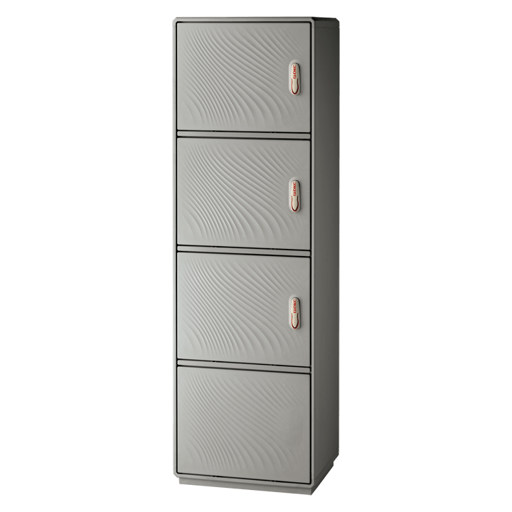 Characteristics Made with 3 equipment compartments separated by an intermediate partition + bottom plinth integrated in a single support structure. Rated insulation voltage Ui 690V. Complete with fixing frame for installation on a concrete base. Hinged door complete with closing mechanism operated by a retracting handle and Y21 singlecipher safety lock (DIN18252 profile cylinder - customized cipher on request). Door opening side can be changed on site even on a single compartment (for detailed information consult the accessories selection). Arrangement of the compartments (upper / intermediate / lower) modifiable on site according to the needs of installation of equipment and internal accessories (DOTPER® system) Can be equipped with mounting plates and dedicated accessories for creating panels. Mounting plates equipped with studs that can be fitted with threaded inserts with M6x20 stud bolts for fixing accessories. Closing bottom plate with conical fairleads and seal (only IP55 versions). Materials Made of RAL 7035 color fiberglass-reinforced plastic. Handle in thermoplastic resin. Rotating bracket in galvanized steel. Internal rods and posts in steel with GEOMET 321 treatment. Concealed external hinges in stainless steel. Seals in vulcanized thermoplastic elastomer. Standards IMQ certification made in accordance with standard CEI EN 62208. Protection classes IP55 and IP44 in compliance with CEI EN 60529, IK10 according to CEI EN 62262. Pre-engineered for apparatus in class II according to CEI 64-8/4