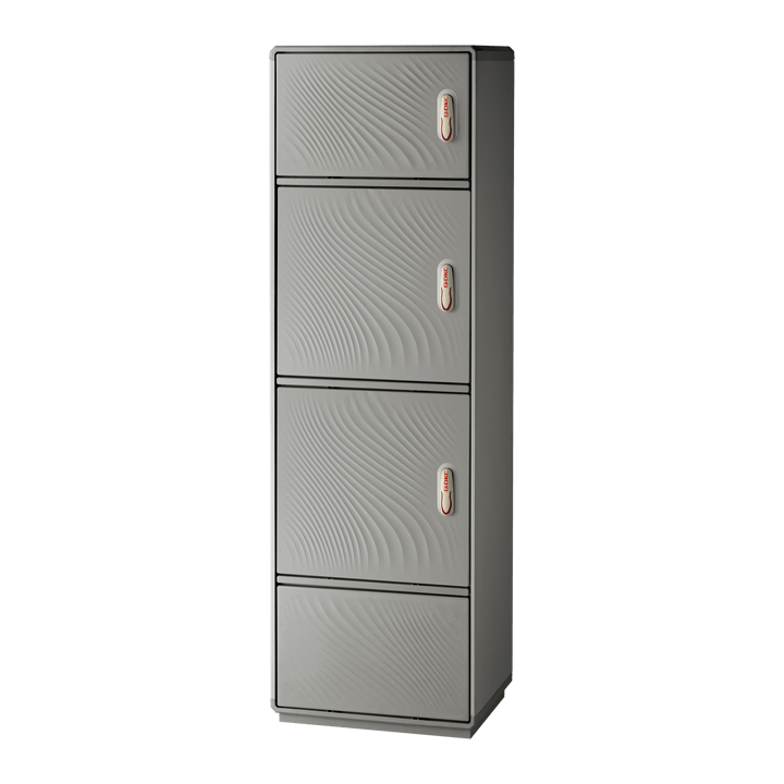Characteristics Made with 3 equipment compartments separated by an intermediate partition + bottom plinth integrated in a single support structure. Rated insulation voltage Ui 690V. Complete with fixing frame for installation on a concrete base. Hinged door complete with closing mechanism operated by a retracting handle and Y21 singlecipher safety lock (DIN18252 profile cylinder - customized cipher on request). Door opening side can be changed on site even on a single compartment (for detailed information consult the accessories selection). Arrangement of the compartments (upper / intermediate / lower) modifiable on site according to the needs of installation of equipment and internal accessories (DOTPER® system) Can be equipped with mounting plates and dedicated accessories for creating panels. Mounting plates equipped with studs that can be fitted with threaded inserts with M6x20 stud bolts for fixing accessories. Closing bottom plate with conical fairleads and seal (only IP55 versions). Materials Made of RAL 7035 color fiberglass-reinforced plastic. Handle in thermoplastic resin. Rotating bracket in galvanized steel. Internal rods and posts in steel with GEOMET 321 treatment. Concealed external hinges in stainless steel. Seals in vulcanized thermoplastic elastomer. Standards IMQ certification made in accordance with standard CEI EN 62208. Protection classes IP55 and IP44 in compliance with CEI EN 60529, IK10 according to CEI EN 62262. Pre-engineered for apparatus in class II according to CEI 64-8/4