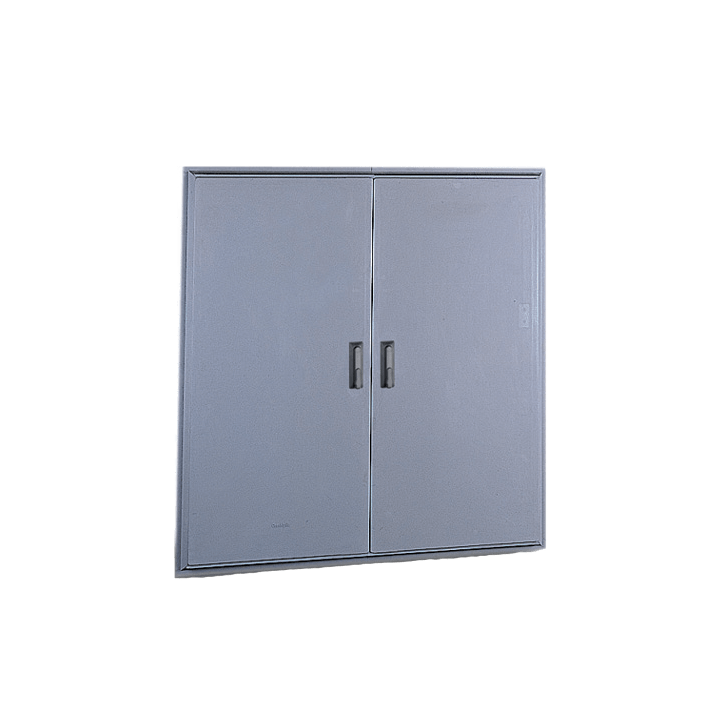 Materials Door and frame moulded in SMC (fiberglass) - grey RAL 7040 color. Hinged door openable beyond 90°, complete with 3 points latch with key. Internal hinges in aluminium alloy turning on self-locking pads made of thermoplastic material. Characteristics Complete with galvanized and passivated door fixing supports to wall in or fix with expansion plugs. Ventilation labyrinth around door perimeter. On request: Granite colours light grey - dark grey - antique pink. Protection degree IP 43 in compliance with CEI EN 60529, IK 10 according to CEI EN 62262. Executions WL = without lock. Prearrangement locks application series SCS 86/... - SCM 86/....to order separately.