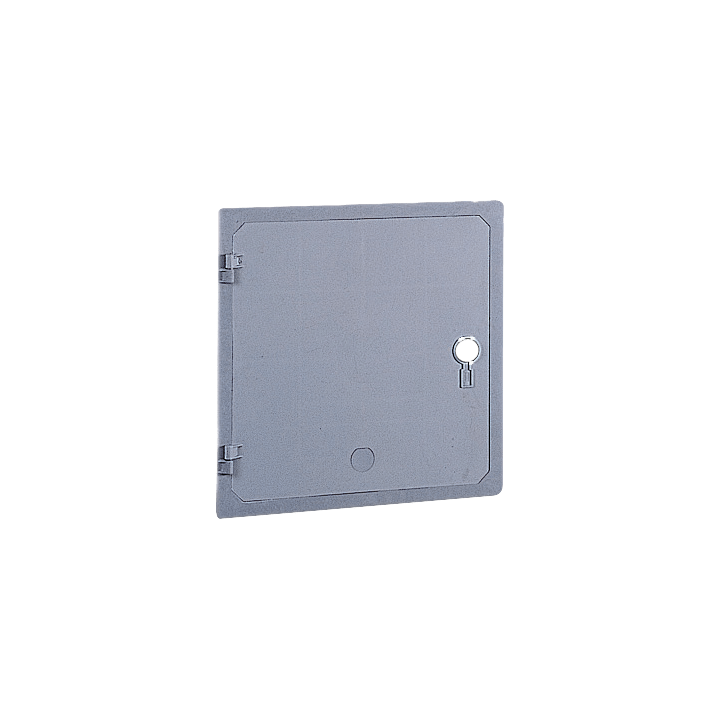Materials Door and frame moulded in SMC (fiberglass) - grey RAL 7040 color. Characteristics Hinged door complete 3 points latch operated by key. Opening angle over 90°. Ventilation labyrinth around door perimeter. Complete with galvanized and passivated door fixing supports to wall in or fix with expansion plugs. Types TPV/71 - TPV/74 - TPV/75 and derived versions complete with locks with retracting handle accessible by means of safety lock and Y21 cipher. Granite colours available on request: light grey - dark grey - antique pink. Protection degree IP 43 in compliance with CEI EN 60529 and IK 10 according to CEI EN 50102. Executions WL = without lock. Prearrangement locks application series SCS 86/... - SCM 86/....to order separately