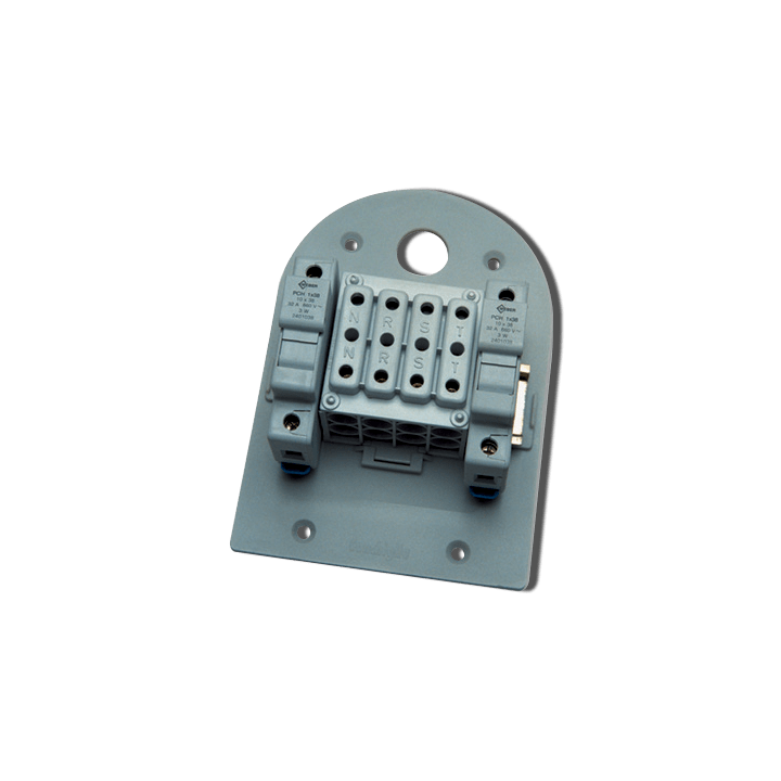 Materials Mounted on a plate in thermoplastic material reinforced with fiber glass (Pa6-R), fixed to the bottom of the pullbox with screws. Characteristics Quadripolar terminal block. Insulation voltage 450V - current 80A max. 1.5 - 25 sq.mm main wiring - shunt 1.5 - 4 sq.mm Fuse holder for 10x38 mm - 660V - 32A cartridge fuse. 1.5 - 4 sq.mm wire clamping. Protection degree IP 20.