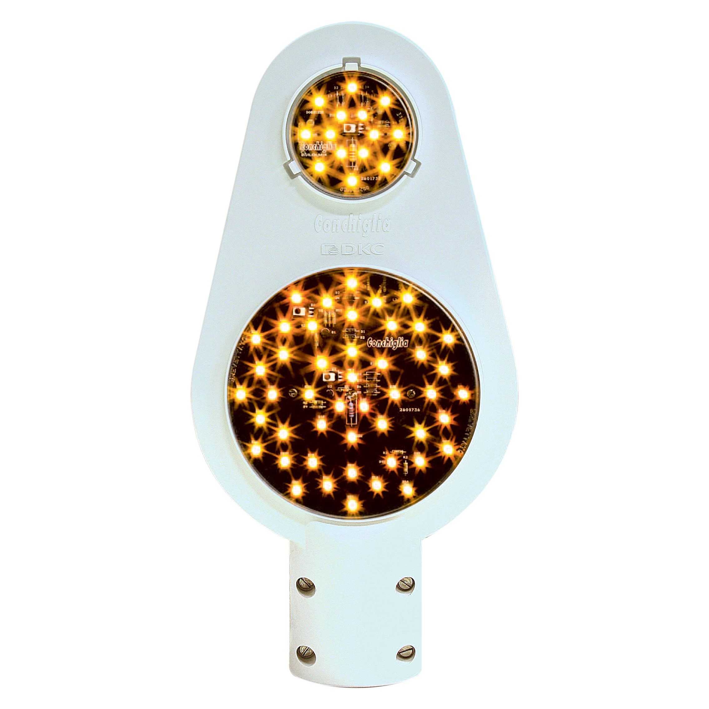 Materials Top made of white polyamide resin. Tubular support made of high molecular density polythene with high resistance to UV rays. AISI 304 stainless steel screws. 4 x 16 mm² terminal block supplied. Optical apparatus Lamp consisting of 47 7 cd amber colored LEDs, wavelength 592 nm distributed on two independent circuits: 36 LEDs on outer circular crown with inner diameter 95mm – outer diameter 145 mm (power input 2,4 VA) and 11 LEDs on central surface with outer diameter 60 mm (power input 1.2 VA). Orange colored upper reflex reflector (diameter 80). Removable coulisse sliding cover for access to optical apparatus can be closed with a latch by means of a tool. Top dimensions 210 x 423 x 128mm. Power supply By means of control units CSE3/220/50/13 - CSE3/220/50/23; input voltage 230 Vac; output voltage 48 Vac. Protection degree: IP 43 in accordance with CEI EN 60529. Protection against impact: IK 08 in accordance with CEI EN 62262. Protection degree of optical apparatus: IP 67 in accordance with CEI EN 60529. Applications: Exits, bends and dangerous sections. Roundabouts and cross-roads. Acceleration and deceleration lanes motorways and highways. Versions ..../F - For mounting on tubular support 1 1/2” G (diam. 49) with smooth end.