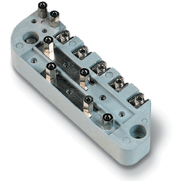 Materials Insulating base moulded in SMC (fiberglass). Terminals in nickel-plated pressed brass (OT58 - UNI 5705-65). Clamping grub screws in nickel-plated steel. Mobile parallel jumpers in nickel-plated brass. Characteristics Jumper clamping studs in nickel-plated brass with 4 hole to connect instruments. Using the jumpers and studs, all the input terminals can be connected in parallel. Applications For active cathodic protection stations. For potential connections for electric measurements and for checking interference and pipe insulation. For electrical connection between several pipes to extend cathodic protection or for measuring and checking reciprocal interference and taking electrical measurements. For shunting dielectric joints.