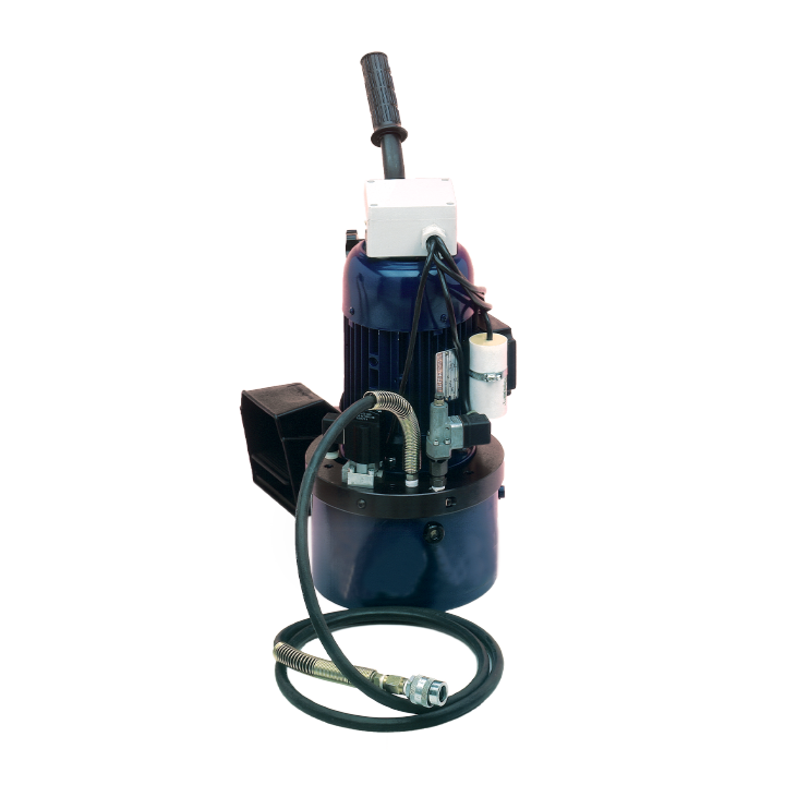 Electrical power pack. Equipment used to rapidly operate all Cosmec tools. It is fitted out with an adjustable pressure switch, which upon completion of the job, stops the motor, thus permitting the immediate opening of the tools. The high number of manufactured models and the technology used make it possible for this equipment to be absolutely reliable even for particularly heavy- duty jobs. It is supplied complete of a 2 mt. long pipe for high pressure with 1/4” CEJN female quick coupling. • Single - phase electric motor 220 V - 50Hz • Electrical input 1 HP • Working pressure 55 MPa (550 bar) • Adjustable pressure switch • 24 V device for the controls • Telescopic handle • Safety pedal • Capacity 0,9 l/min • Tank capacity 3 l • Prearranged for Electrical Goniometer and PFB Drilling 009012 • It is equipped with wheels to facilitate its movement • Total Weight 37 Kg Hydraulic oil that meets ISO-L-FC specifications (Viscosity 2.7mm2/sec at 100°C)
