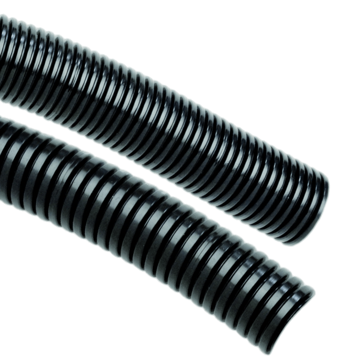 Flexible corrugated polyamide conduits PA 6F protected by stainless steel braided sleeving, thick profile. Designed for optimum flexibility, high compression resistance and excellent response to impact; ideal requirements in all applications for protecting and isolating electrical installations. The conduits are protected by a stainless steel braided sleeving to give them a high resistance to wear, impact, abrasion and parks. The conduits are protected by a AISI 304 stainless steel braided sleeving to give them a high resistance to wear, impact, abrasion and sparks. Excellent resistance to most chemical substances such as oils (max. temp. +80°C), benzine, acids and solvents. Self-extinguishing and halogen, silicone and cadmium-free. Low fume emission in the event of fire makes these conduits particularly suitable for applications in the rail sector and all places where there is a greater risk of fire. Corrugated internal and external surfaces ensure excellent sliding through of cables, significantly easier than with flexible PVC conduits. Note: the dimensions refer to the polyamide conduit, indicatively the braided sleeving increases the thickness of the external diameter by 1.5mm.