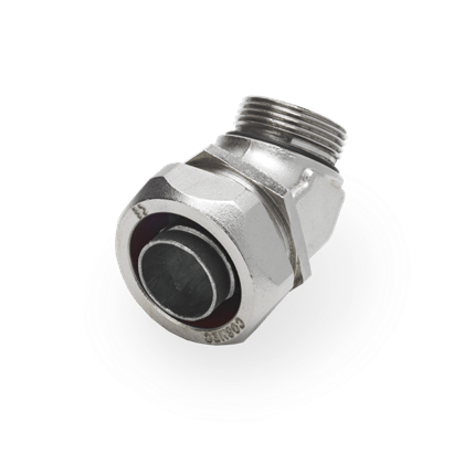 Metal elbow fittings for metal flexible conduits made of brass which is then nickel plated in order to improve resistance to the harsh environmental conditions in which they are used. Part no. 6024 bent to 45°, and an o-ring seal that guarantees its tightness. The use of these fittings is in order to achieve a correct application of flexible conduits, which will avoid bending and twisting that would damage the conduits as well as the cables housed within. It also results in a reduction of cable clutter. Produced with ISO Metric thread in compliance with CEI EN 60423.CEI EN 60423.
