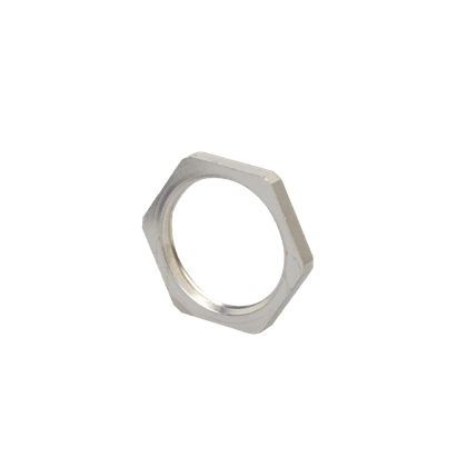 Flist ring nuts made of brass which is then nickel plated in order to improve resistance to hard environmental conditions in which they are used. Produced from a hexagonal bar they have a reduced thickness. That allow threaded connectors to be coupled to other equipment (boxes, cabinets, ducting) that have no threaded holes. The thread is ISO metric in compliance with CEI EN 60423.