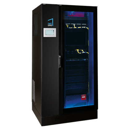 Net One cabinet with compact 4000W air conditioner and 5KVA UPS 15 minutes at 4000W load, environmental data monitoring.