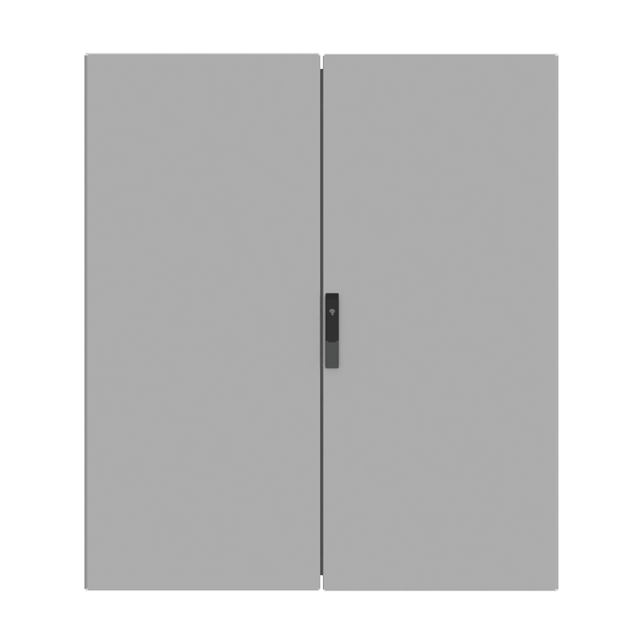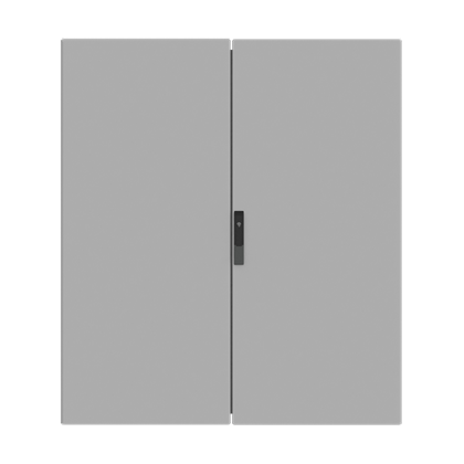 Blank double door for CAE horizontal cabinet. Manufactured of 20/10 thick steel, painted textured RAL 7035, with rounded safety edges. Complete with an internal reinforcement frame made of galvanized tubular profile. 4 closing points, 8 hinges and an escutcheon with a double-bit lock insert Ø3 mm.
