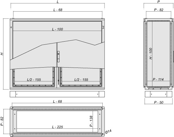 CAE Compact Horizontal Cabinet. Structure: solid sides and top, manufactured of 15/10 steel, painted RAL 7035 with textured epoxy-polyester, adjustable cable gland bottom. Rear panel: 15/10 thick steel, painted textured RAL 7035, 15/10 thick steel, with rounded safety edges, with 6 - 8 points of fastening to the structure. Double door: 20/10 thick steel, painted textured RAL 7035, with rounded safety edges. Complete with an internal reinforcement frame made of galvanized tubular profile, 2 closing points, 2 hinges and an escutcheon with a double-bit lock insert Ø3 mm. Impact resistance degree as per IEC EN 62208: IK10. Protection degree: IP55 EN 60529 UL NEMA type 12 (referred to cabinets complete with doors).