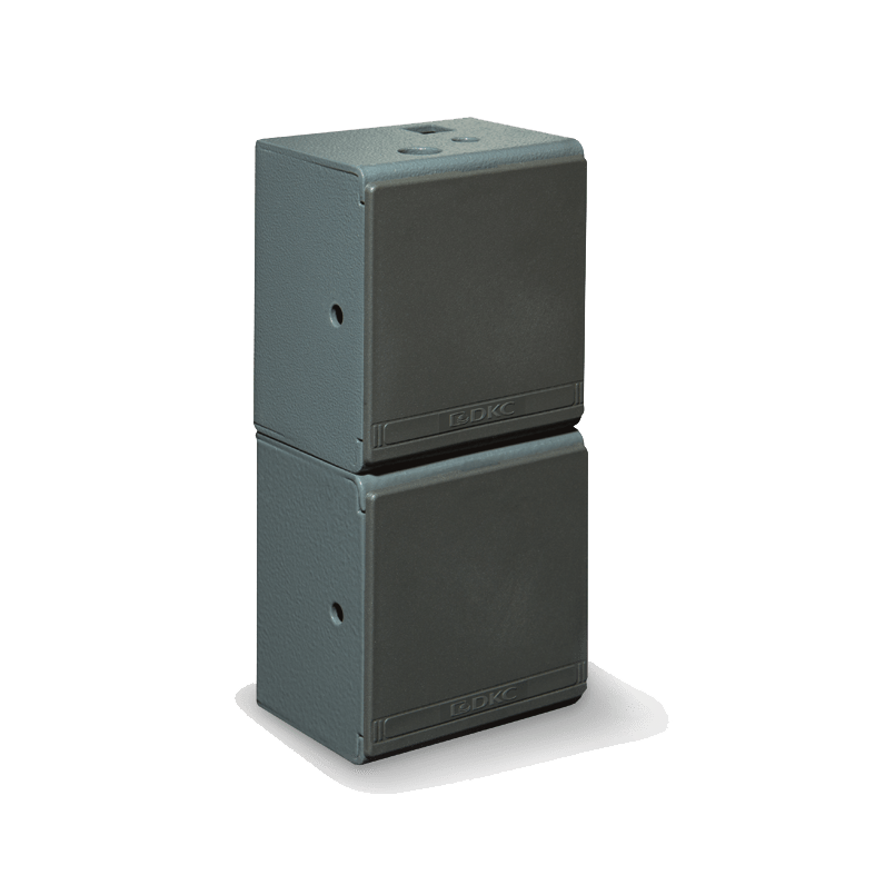 Corner plinth made of 25/10 thick, painted RAL 7011 painted steel sheet with plastic front closure.