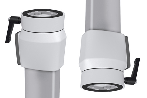 TS SERIES straight joint for connecting the container to the vertical part of the arm system. Made of aluminum alloy, color RAL 7035. Includes fixing screws and gaskets. Can be combined with RZTSCB01 series box reinforcement.