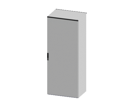 La porta, con bordi antinfortunistici, è in acciaio zincato (20/10) e verniciata (RAL 7035). Dispone di 4 punti di chiusura, 4 cerniere e una serratura a doppio pettine. Ha un grado di resistenza all'urto IK10 e garantisce la continuità elettrica tra struttura e pannelli tramite una guarnizione conduttiva, rispettando il grado IP secondo gli standard EN 60529/IEC EN 62208.