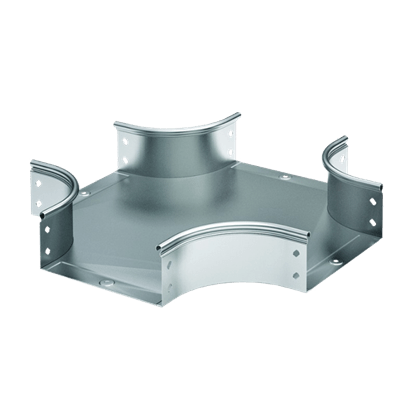 La derivazione piana a croce è predisposta per il fissaggio ad incastro nelle estremità Femmina degli elementi rettilinei. Al centro di ogni estremità delle basi un'area anulare a rilievo forata garantisce la continuità elettrica.