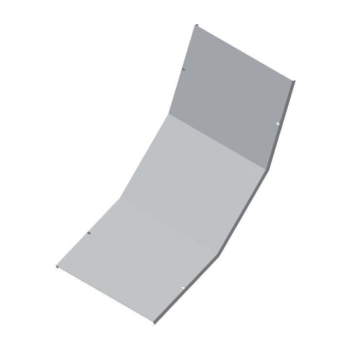 Coperchio curva salita 90° in acciaio zincato a caldo dopo lavorazione. Fissaggio all'accessorio tramite apposito gancio. Tipo: piano. A richiesta: - Larghezza: 700-800-900-1000; - Raggio: 300-900; - Spessore: 0,6-1,5,2* (*solo per il materiale zincato a caldo); - Materiale: Acciaio zincato a caldo, AISI304 - AISI316, alluminio; - Tipo: spiovente