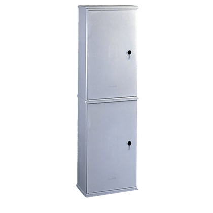 Materiali Stampati in SMC (vetroresina) – Colore grigio RAL 7040. Cerniere interne in resina termoplastica a base poliarillamidica rinforzata con fibra di vetro (IXEF). Parti metalliche esterne in acciaio inox o in acciaio tropicalizzato e verniciato grigio, elettricamente isolate con l’interno. Corpo serratura in vetroresina e integrato nello sportello. Maniglia in resina Poliammidica. Perno di manovra serratura in lega di alluminio. Aste e paletti interni in acciaio con trattamento Geomet 321. Caratteristiche Armadio conforme a norma CEI EN 62208. Tensione nominale di isolamento Ui 690V. Porta incernierata completa di chiusura tipo cremonese azionabile con maniglia a scomparsa e con chiusura in tre punti per garantire una perfetta aderenza dello sportello. Maniglia predisposta per cilindro a profilato DIN 18252 con chiave di sicurezza a cifratura unica Y21 (per vano inferiore) e Y12 (per vano superiore). Setto divisione vani completo di passacavi. Prese d’aria inferiori e sottotetto per ventilazione naturale interna. Per posa autonoma a pavimento con telaio di ancoraggio (da ordinare separatamente). I prodotti BVT/T-P e BVT/T-WLP definiscono la batteria fornita su pallet in confezioni standard di 4 pz. Per scelta accessori fare riferimento all’armadio singolo costituente il vano Grado di protezione IP 44 secondo CEI EN 60529, IK 10 secondo CEI EN 62262. Esecuzioni standard complete di serrature con leva a scomparsa. Esecuzioni WL – Senza serratura e predisposte esclusivamente per utilizzo di serrature serie SCS-SCM.