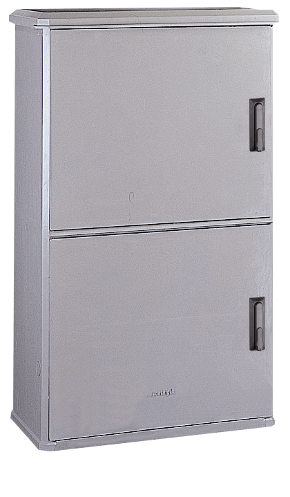 Materiali Stampati in SMC (vetroresina) – Colore grigio RAL 7040. Cerniere interne in resina termoplastica a base poliarillamidica rinforzata con fibra di vetro (IXEF). Parti metalliche esterne in acciaio inox o in acciaio tropicalizzato e verniciato grigio, elettricamente isolate con l’interno. Caratteristiche Conforme a norma CEI EN 62208. Tensione nominale di isolamento Ui 690V. Porta incernierata completa di chiusura tipo cremonese azionabile con maniglia a scomparsa agibile mediante serratura di sicurezza a cifratura unica (codice 21). Setto divisione vani completo di passacavi. Esecuzione in struttura unica. Prese d’aria inferiori e sottotetto per ventilazione naturale interna. Per posa autonoma pavimento con telaio di ancoraggio (da ordinare separatamente). Parete di fondo dotata di inserti annegati di stampaggio in ottone per applicazioni apparecchiature direttamente o attraverso piastra di fondo. Grado di protezione IP 44 secondo CEI EN 60529, IK 10 secondo CEI EN 62262. Esecuzioni WLP – senza serratura. Predisposizione per applicazioni serrature serie SCS 86/.. – SCM 86/.. da ordinare separatamente. Le dimensioni utili, riportate in tabella, indicano lo spazio massimo disponibile per equipaggiamenti nel rispetto delle caratteristiche certificate dalla norma CEI EN 62208 (spazio utile protetto).