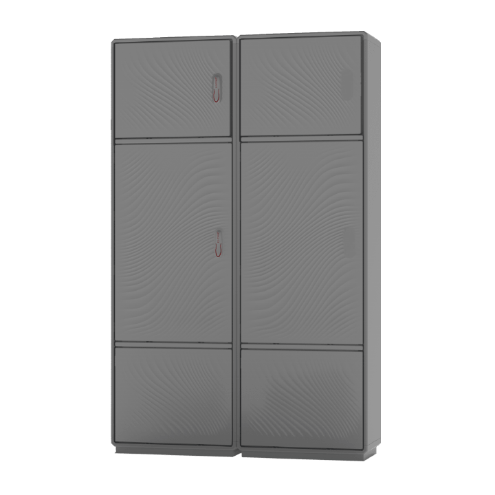 Caratteristiche Realizzati con due vani apparecchiature separati da setto intermedio + zoccolo inferiore integrati in unica struttura di sostegno. Tensione nominale di isolamento Ui 690V. Completi di telaio di ancoraggio per installazione su basamento in calcestruzzo. Porte incernierate complete di chiusura azionabile con maniglia a scomparsa e serratura di sicurezza a cifratura unica Y21 su tutti i vani (cilindro a profilato DIN18252 - a richiesta cifrature differenziate). Lato di apertura ante modificabile in opera, anche su singolo vano (per informazioni dettagliate consultare la sezione Accessori). Disposizione dei vani (superiore/intermedio) modificabile in opera secondo le necessità di installazione apparecchiature e accessori interni (sistema DOTPER®). Equipaggiabili con piastre di fondo e accessori dedicati per realizzazione quadri. Pareti di fondo munite di borchie predisposte per inserimento inserti filettati con prigioniero per fissaggio accessori M6x20. Setto di chiusura inferiore con passacavi conici e guarnizione di tenuta (solo esecuzioni IP55). Materiali Realizzati in vetroresina colore RAL 7035. Maniglia in resina termoplastica. Tenone di manovra in acciaio zincato. Aste e paletti interni in acciaio con trattamento GEOMET 321. Cerniere esterne non accessibili in acciaio inox. Telaio in acciaio zincato e verniciato. Guarnizioni di tenuta realizzate in EPDM espanso. Normative Certificazione IMQ secondo norma CEI EN 62208. Grado di protezione IP55 ed IP44 secondo CEI EN 60529, IK10 secondo CEI EN 62262. Predisposti per esecuzione di apparecchiature in classe II secondo CEI 64-8/4.