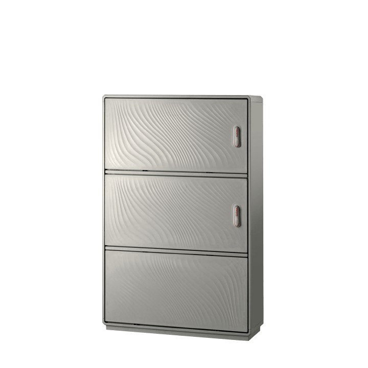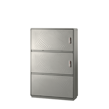 Caratteristiche Realizzati con due vani apparecchiature separati da setto intermedio + zoccolo inferiore integrati in unica struttura di sostegno. Tensione nominale di isolamento Ui 690V. Completi di telaio di ancoraggio per installazione su basamento in calcestruzzo. Porte incernierate complete di chiusura azionabile con maniglia a scomparsa e serratura di sicurezza a cifratura unica Y21 su tutti i vani (cilindro a profilato DIN18252 - a richiesta cifrature differenziate). Lato di apertura ante modificabile in opera, anche su singolo vano (per informazioni dettagliate consultare la sezione Accessori). Disposizione dei vani (superiore/intermedio) modificabile in opera secondo le necessità di installazione apparecchiature e accessori interni (sistema DOTPER®). Equipaggiabili con piastre di fondo e accessori dedicati per realizzazione quadri. Pareti di fondo munite di borchie predisposte per inserimento inserti filettati con prigioniero per fissaggio accessori M6x20. Setto di chiusura inferiore con passacavi conici e guarnizione di tenuta. Materiali Realizzati in vetroresina colore RAL 7035. Maniglia in resina termoplastica. Tenone di manovra in acciaio zincato. Aste e paletti interni in acciaio con trattamento GEOMET 321. Cerniere esterne non accessibili in acciaio inox. Telaio in acciaio zincato e verniciato. Guarnizioni di tenuta realizzate in EPDM espanso. Normative Certificazione IMQ secondo norma CEI EN 62208. Grado di protezione IP55 secondo CEI EN 60529, IK10 secondo CEI EN 62262. Predisposti per esecuzione di apparecchiature in classe II secondo CEI 64-8/4.