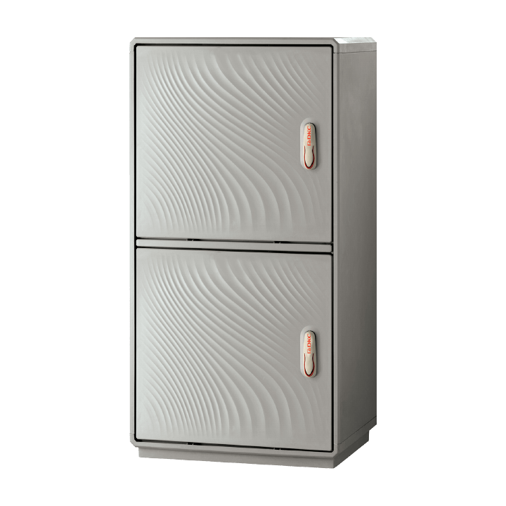 Caratteristiche Realizzati con due vani apparecchiature integrati in unica struttura di sostegno separati da setto intermedio. Tensione nominale di isolamento Ui 690V. Completi di telaio di ancoraggio per installazione su basamento in calcestruzzo. Porte incernierate complete di chiusura azionabile con maniglia a scomparsa e serratura di sicurezza a cifratura unica Y21 su tutti i vani (cilindro a profilato DIN18252 - a richiesta cifrature differenziate). Lato di apertura ante modificabile in opera, anche su singolo vano (per informazioni dettagliate consultare la sezione Accessori). Disposizione dei vani (superiore/inferiore) modificabile in opera secondo le necessità di installazione apparecchiature e accessori interni (sistema DOTPER®). Equipaggiabili con piastre di fondo e accessori dedicati per realizzazione quadri. Pareti di fondo munite di borchie predisposte per inserimento inserti filettati con prigioniero per fissaggio accessori M6 x 20. Setto di chiusura inferiore con passacavi conici e guarnizione di tenuta. Materiali Realizzati in vetroresina colore RAL 7035. Maniglia in resina termoplastica. Tenone di manovra in acciaio zincato. Aste e paletti interni in acciaio con trattamento GEOMET 321. Cerniere esterne non accessibili in acciaio inox. Telaio in acciaio zincato e verniciato. Guarnizioni di tenuta realizzate in EPDM espanso. Normative Certificazione IMQ secondo norma CEI EN 62208. Grado di protezione IP55 secondo CEI EN 60529, IK10 secondo CEI EN 62262. Predisposti per esecuzione di apparecchiature in classe II secondo CEI 64-8/4.
