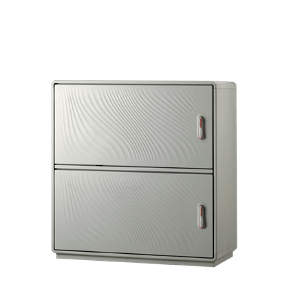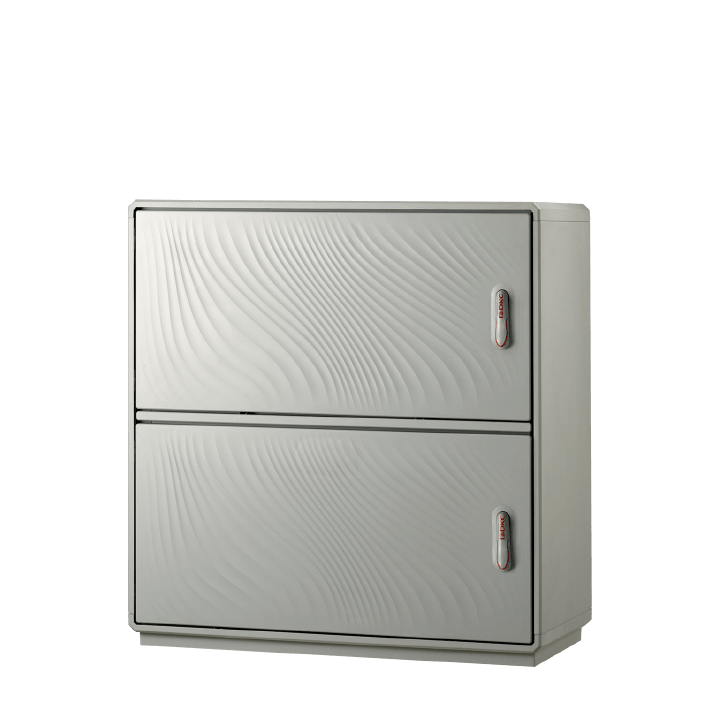 Caratteristiche Realizzati con due vani apparecchiature integrati in unica struttura di sostegno separati da setto intermedio. Tensione nominale di isolamento Ui 690V. Completi di telaio di ancoraggio per installazione su basamento in calcestruzzo. Porte incernierate complete di chiusura azionabile con maniglia a scomparsa e serratura di sicurezza a cifratura unica Y21 su tutti i vani (cilindro a profilato DIN18252 - a richiesta cifrature differenziate). Lato di apertura ante modificabile in opera, anche su singolo vano (per informazioni dettagliate consultare la sezione Accessori). Disposizione dei vani (superiore/inferiore) modificabile in opera secondo le necessità di installazione apparecchiature e accessori interni (sistema DOTPER®). Equipaggiabili con piastre di fondo e accessori dedicati per realizzazione quadri. Pareti di fondo munite di borchie predisposte per inserimento inserti filettati con prigioniero per fissaggio accessori M6 x 20. Materiali Realizzati in vetroresina colore RAL 7035. Maniglia in resina termoplastica. Tenone di manovra in acciaio zincato. Aste e paletti interni in acciaio con trattamento GEOMET 321. Cerniere esterne non accessibili in acciaio inox. Telaio in acciaio zincato e verniciato. Guarnizioni di tenuta realizzate in EPDM espanso. Normative Certificazione IMQ secondo norma CEI EN 62208. Grado di protezione IP44 secondo CEI EN 60529, IK10 secondo CEI EN 62262. Predisposti per esecuzione di apparecchiature in classe II secondo CEI 64-8/4.