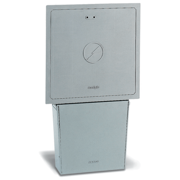 Materiali Stampati in SMC (vetroresina), colore grigio RAL 7040. Caratteristiche Coperchio incernierato ad incastro asportabile in apertura. Zanche a murare in acciaio zincato a caldo. Aerazione interna ricavata sul perimetro del coperchio. Chiusura coperchio: Tipi CPD – CPE: con chiave ad impronta triangolare. Tipi CPF: con serratura di sicurezza agibile con chiave a spillo cfr. 630. Tipi CPEE: con serratura di sicurezza agibile con chiave cfr. Y21 con coperchio incernierato esternamente. Grado di protezione IP 43 secondo CEI EN 60529; IK 10 secondo CEI EN 62262. Esecuzioni/C: con due finestre opposte chiuse con portine in materiale termoplastico a foratura prestabilita per passaggio cavi. Esecuzioni/D-DA: con due finestre opposte di cui la superiore chiusa con portina in materiale termoplastico a frattura prestabilita per passaggio cavi, l’inferiore completa di raccordo a cono a finestra aperta o con raccordo a cono trapezoidale con coperchio apribile e completo di passacavi.