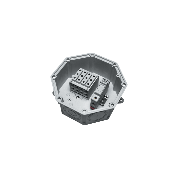 Materiali Cassette complete di morsettiera multipla quadripolare con base in materiale termoplastico PA6V0 e n.1 portafusibile. Corpo cassetta e coperchio realizzati in materiale termoplastico poliammide PA6V0+30% f.v. Colore grigio RAL 7035. Viti coperchio antiperdenti. Guarnizione di tenuta in poliuretano espanso resistente agli agenti atmosferici e ai raggi UV. Caratteristiche Predisposizione mediante foratura all’applicazione di accessori per ingresso/uscita/derivazione cavi quali: raccordi tubo/cassetta; pressacavi; disposti n. 4 ortogonalmente a 90° tra loro rispetto il perimetro della cassetta o in alternativa n. 3 a 45° nella parte inferiore della cassetta*. Viti coperchio antiperdenti. Applicazioni/installazioni Per impianti industriali, per illuminazione pubblica, per alimentazione di quadri di distribuzione con cavi uni/multipolari. Per installazione esterna a parete con fissaggio mediante chiodi o tasselli, incassate a muro o a palo mediante staffa di fissaggio (da ordinare separatamente) per impianti con cavi aerei precordati. Esecuzioni vuote in classe II. Grado di protezione. IP 54 secondo CEI EN 60529, IK09 secondo CEI EN 62262. UPM16/10: con portafusibile sezionabile per fusibile 8,5x31,5. UPM25/10: con portafusibile sezionabile per fusibile 10,3x38. *Le cassette sono fornite complete di n° 3 passacavi conici.