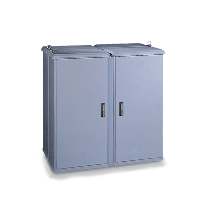 Materiali Stampati in SMC (vetroresina) – Colore grigio RAL 7040. Cerniere interne in resina termoplastica a base poliarillamidica rinforzata con fibra di vetro (IXEF). Parti metalliche esterne in acciaio inox o in acciaio tropicalizzato e verniciato grigio, secondo norme CEI 7-6, elettricamente isolate con l’interno. Caratteristiche Porta a due ante incernierata completa di serratura tipo cremonese azionabile con maniglia a scomparsa agibile mediante serratura di sicurezza a cifratura unica (codice 21). Prese d’aria inferiori e sottotetto per ventilazione naturale interna. Per posa autonoma pavimento con telaio di ancoraggio. Golfari di sollevamento. Grado di protezione IP 44 secondo CEI EN 60529, IK 10 secondo CEI EN 62262. Sui modelli CM…/../A2 non è possibile l’applicazione delle piastre di fondo. Vano interno aperto. Possibilità di accedere alle apparecchiature da entrambi i lati (anteriore e posteriore). Applicazioni: per garantire protezione alle apparecchiature ingombranti mediante incapsulamento.