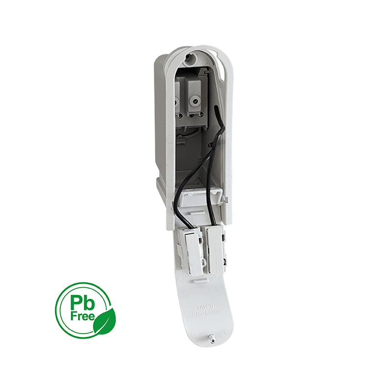 Contenitore stampato in resina poliammidica autoestinguente VO a 0,75 mm (norme UL-94) ed antitraccia CTI 600 (secondo IEC 112). Base isolante stampata in poliammide 6 autoestinguente VO a 0,75 mm (UL-94) ed antitraccia CTI 600 (secondo IEC 112). Morsetti in alluminio (EN 46100) con trattamento superficiale anticorrosione a 3 vie per polo. Serraggio indipendente dei conduttori con viti in acciaio inox AISI 304 (impronta esagonale incassata). Tensione nominale 450 V; corrente max 30 A. Portafusibile realizzato su circuito stampato per fusibili 5 x 20, omologato UL CSA VDE, tensione 250 V, portata max 6,3A. serraggio max cavo da 4 mmq. Per incasso su pali diametro minimo 76 mm (rilievo all’altezza della feritoia) con feritoia 38x132 mm a testate semitonde. Contenitore in classe II (doppio isolamento) secondo CEI 64-8/4. Grado di protezione: sul perimetro coperchio IP 43, in zona ingresso cavi IP23B (secondo norme CEI EN 60529), IK 08 secondo CEI EN 62262.