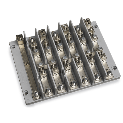 Materiali Base isolante stampata in SMC (vetroresina) con separatori in corpo unico. Morsetti stampati in ottone UNI EN 12165, nichelati. Cilindretti di sezionamento in rame, nichelati. Caratteristiche Cablaggio dorsale (ingresso / uscita) con capicorda predisposti con foro per viti M12. A 4 vie sezionabili, 3 da 120 mmq, una derivazione da 50 mm2. Adatta esclusivamente al montaggio in contenitori con fondo isolante. Grado di protezione IP 00 secondo CEI EN 60529.