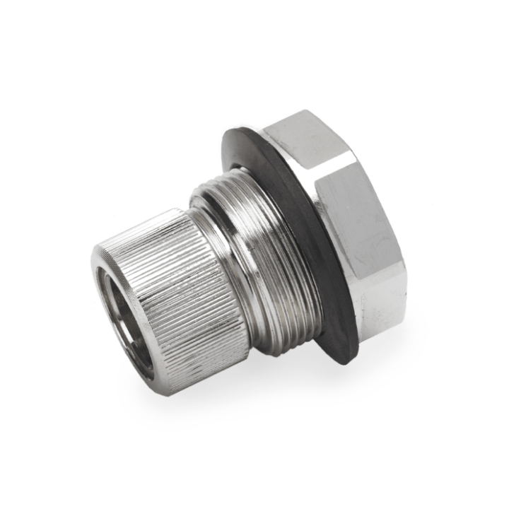 Adattatori con bloccaggio conico dello schermo EMC per tubi in poliammide con calza interna in rame stagnato. Realizzati in ottone nichelato, questi adattatori sono compatibili con tutta la gamma di raccordi in poliammide con filetto maschio. Il serraggio della treccia è realizzato mediante un elemento conico che agisce sull’intera circonferenza, garantendo la continuità del sistema nelle applicazioni soggette a sollecitazioni meccaniche ed un elevato livello di sicurezza in caso di cortocircuito. Le interferenze dei segnali elettrici generate dai campi magnetici, sono trasferite agli involucri tramite la treccia metallica e gli adattatori di bloccaggio EMC. Particolarmente indicati in applicazioni industriali, bordo macchine utensili e veicoli ferroviari (in abbinamento a tubi flessibili a bassa emissione di fumi, in conformità alla norma UNI CEI 11170). Filettatura PG secondo DIN 40430.