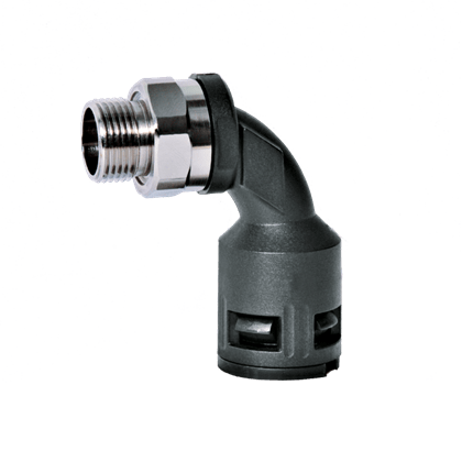 Raccordi curvi 90° filetto maschio metallico girevole realizzati in poliammide. La parte terminale è costituita da un inserto filettato in ottone nichelato. Indicati per applicazioni in condizioni particolari di temperatura e di sollecitazioni meccaniche. La filettatura è metrica ISO in conformità con le norme CEI EN 60423.