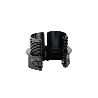 Raccordi per tubi con taglio longitudunale. Sono accessori speciali realizzati in poliammide PA 6 modificato, composti da due parti richiudibili per l’impiego con i tubi dotati di apertura longitudinale, per l’installazione del sistema di protezione su impianti già cablati. Le filettature proposte sono Metrico ISO in conformità alle norme CEI EN 60423. Colore nero.