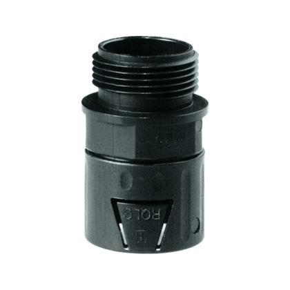 Raccordi monopezzo prodotti in poliammide. Le caratteristiche peculiari di questi raccordi sono: la semplicità di montaggio; l'ottima resistenza alle vibrazioni ed allo strappo; le dimensioni contenute che facilitano l'installazione ravvicinata e l'accoppiamento con i tubi flessibili prodotti a norme DIN. Sono autoestinguenti e privi di sostanze alogene, silicone e cadmio. Il collegamento raccordo-tubo si ottiene spingendo a fondo il tubo nel raccordo, la cui forma interna liscia e troncoconica, consente di ottenere un grado di tenuta IP66. Filettatura metrica ISO in conformità con le norme CEI EN 60423. (PG secondo DIN 40430 a richiesta).