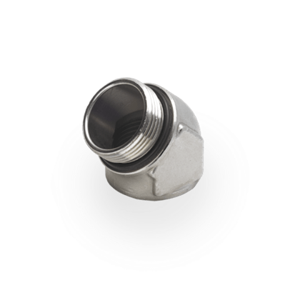 Raccordi metallici curvi a 45°. Sono prodotti da stampaggio, realizzati in ottone e nichelati successivamente per conferire una migliore resistenza alle avverse condizioni ambientali in cui saranno utilizzati. Le estremità presentano una filettatura maschio ed una femmina. La tenuta dell’accoppiamento è garantita dalla guarnizione o-ring alloggiata sull’imbocco maschio. L’accurata realizzazione di questi raccordi, assicura un perfetto infilaggio dei cavi senza rischio di danneggiamento del rivestimento. La filettatura è Metrica ISO in conformità con le norme CEI EN 60423.