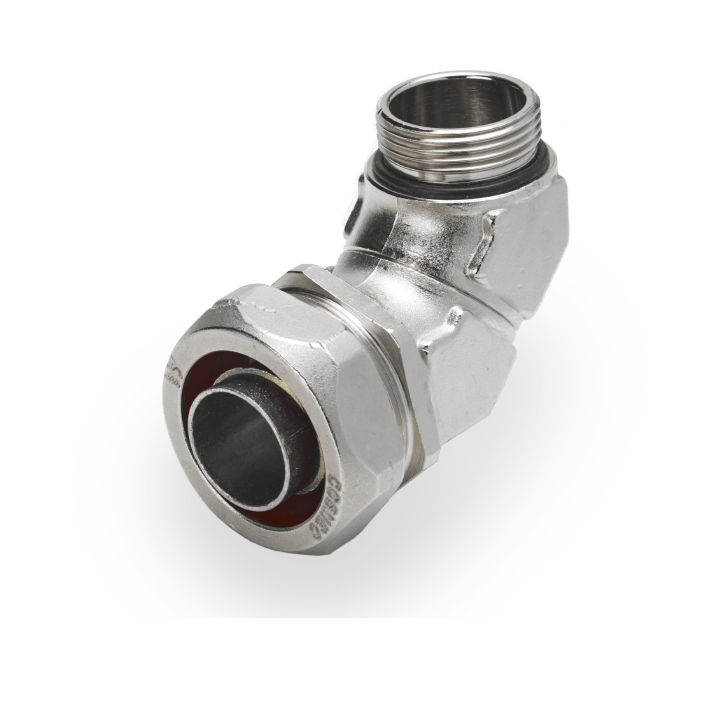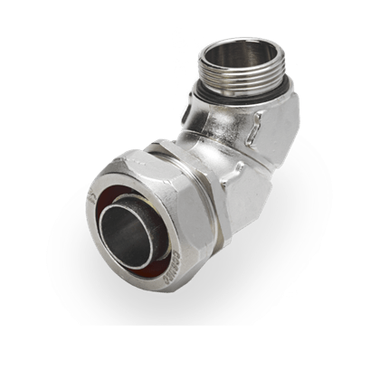 Raccordi curvi a 90° per tubi metallici flessibili. Sono prodotti in ottone, nichelati successivamente per conferire una migliore resistenza alle avverse condizioni ambientali in cui saranno utilizzati. E' realizzato mediante l’accoppiamento di due elementi curvi a 45° perfettamente allineati, la tenuta è garantita da una guarnizione o-ring. Il loro utilizzo è consigliato per una corretta applicazione dei tubi flessibili evitando pieghe e torsioni che danneggerebbero sia i tubi che i cavi al loro interno, ottenendo inoltre una riduzione di ingombro nei cablaggi. Sono prodotti con filetto Metrico ISO in conformità con le norme CEI EN 60423.