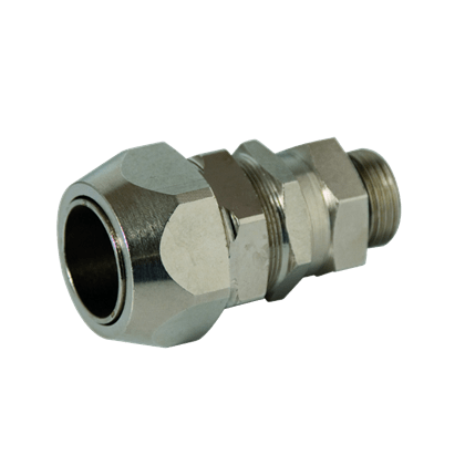 Raccordi maschio girevoli a doppio bloccaggio realizzati in ottone nichelato, consentono il doppio bloccaggio del tubo e della treccia metallica che lo riveste. Questa soluzione tecnica presenta molteplici punti di forza: • Eccellente resistenza a trazione; • Elevato grado IP con tutti i tipi di rivestimento del tubo; • Impedisce forature da contatto accidentale con l’estremità della treccia; • Serraggio treccia sull’intera circonferenza. Versione: T1 per tubi con rivestimento plastico aspirato.