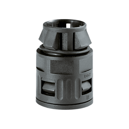 Raccordi passaparete colore nero. La particolare conformazione del terminale consente un rapido aggancio in fori praticati su pareti dello spessore da 1 a 2,5 mm senza l’utilizzo di controdado. La tenuta IP66 dell’accoppiamento è assicurata da una guarnizione O-Ring alloggiata nel raccordo.