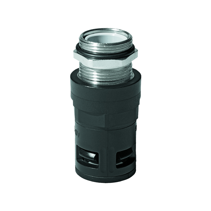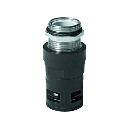 Raccordi pressacavo filetto maschio metallico,colore nero. Composti da un corpo in poliammide e da un terminale in ottone nichelato che funge da pressacavo. La tenuta è garantita da una speciale guarnizione in TPE alloggiata internamente al corpo e dalla guarnizione in polipropilene e gomma applicata nel terminale pressacavo. Vengono normalmente utilizzati in impieghi gravosi in cui è richiesta una notevole resistenza alle sollecitazioni meccaniche. La filettatura è metrica ISO in conformità con le norme CEI EN 60423.