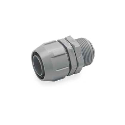 Raccordi universali per tubi flessibili in PVC. Questi raccordi sono considerati universali in quanto, oltre a poter essere utilizzati su diversi tipi di tubi flessibili, hanno la particolarità di poter essere impiegati, a seconda delle necessità, fissi o girevoli. Sono prodotti in PVC e sono costituiti da un corpo dotato di settori elastici dentellati, da un dado di serraggio e da un elemento terminale filettato che, oltre ad essere girevole, ha anche la possibilità di avere una piccola escursione assiale utilizzata per renderlo fisso. Il collegamento raccordo-tubo è ottenuto avvitando il dado sul corpo del raccordo, questo avvitamento provoca la deformazione concentrica dei settori elastici ed il conseguente bloccaggio del tubo, assicurando una perfetta tenuta meccanica. La particolare cura nell’esecuzione di questi raccordi assicura un perfetto infilaggio dei cavi senza rischio di danneggiamento del rivestimento. La filettatura è: PG secondo DIN 40430. Colore: Nero a richiesta.