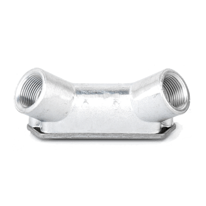 Scatole di infilaggio a due vie a 90° pressofuse in lega di alluminio UNI EN 1706 (ex UNI 4514) con imbocchi filettati. Sono prodotte a due, tre e quattro vie, con imbocchi in asse o perpendicolari, per meglio assecondare le esigenze di installazione. I coperchi sono avvolgenti e le guarnizioni piane assicurano una tenuta stagna IP55. I coperchi vengono forniti in lega di allumino pressofuso (tipo B) Le viti di fissaggio del coperchio e di messa a terra sono prodotte in acciaio zincato, a richiesta possono essere fornite in acciaio inox AISI 304. Per una corretta esecuzione dell’impianto elettrico, le scatole di infilaggio andrebbero installate ogni 4 tratte rettilinee di tubo, per evitare rischi di danneggiamento dell’isolamento durante l’infilaggio dei cavi. La filettatura è: GAS cilindrico UNI ISO 228.