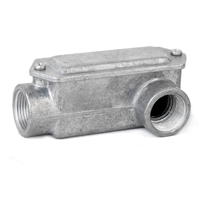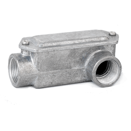 Scatole di infilaggio a due vie destre, pressofuse in lega di alluminio UNI EN 1706 (ex UNI 4514) con imbocchi filettati. Sono prodotte a due, tre e quattro vie, con imbocchi in asse o perpendicolari, per meglio assecondare le esigenze di installazione. I coperchi sono avvolgenti e le guarnizioni piane assicurano una tenuta stagna IP55. I coperchi vengono forniti in lega di allumino pressofuso (tipo B). Le viti di fissaggio del coperchio e di messa a terra sono prodotte in acciaio zincato, a richiesta possono essere fornite in acciaio inox AISI 304. Per una corretta esecuzione dell’impianto elettrico, le scatole di infilaggio andrebbero installate ogni 4 tratte rettilinee di tubo, per evitare rischi di danneggiamento dell’isolamento durante l’infilaggio dei cavi. La filettatura è: GAS cilindrico UNI ISO 228.