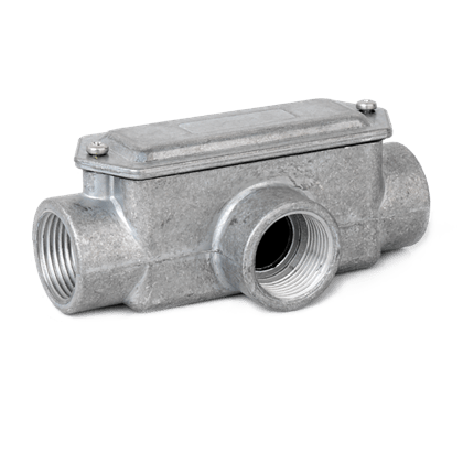 Scatole di infilaggio a tre vie, pressofuse in lega di alluminio UNI EN 1706 (ex UNI 4514) con imbocchi filettati. Sono prodotte a due, tre e quattro vie, con imbocchi in asse o perpendicolari, per meglio assecondare le esigenze di installazione. I coperchi sono avvolgenti e le guarnizioni piane assicurano una tenuta stagna IP55. I coperchi vengono forniti in lega di allumino pressofuso (tipo B). Le viti di fissaggio del coperchio e di messa a terra sono prodotte in acciaio zincato, a richiesta possono essere fornite in acciaio inox AISI 304. Per una corretta esecuzione dell’impianto elettrico, le scatole di infilaggio andrebbero installate ogni 4 tratte rettilinee di tubo, per evitare rischi di danneggiamento dell’isolamento durante l’infilaggio dei cavi. La filettatura è: GAS cilindrico UNI ISO 228.