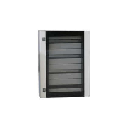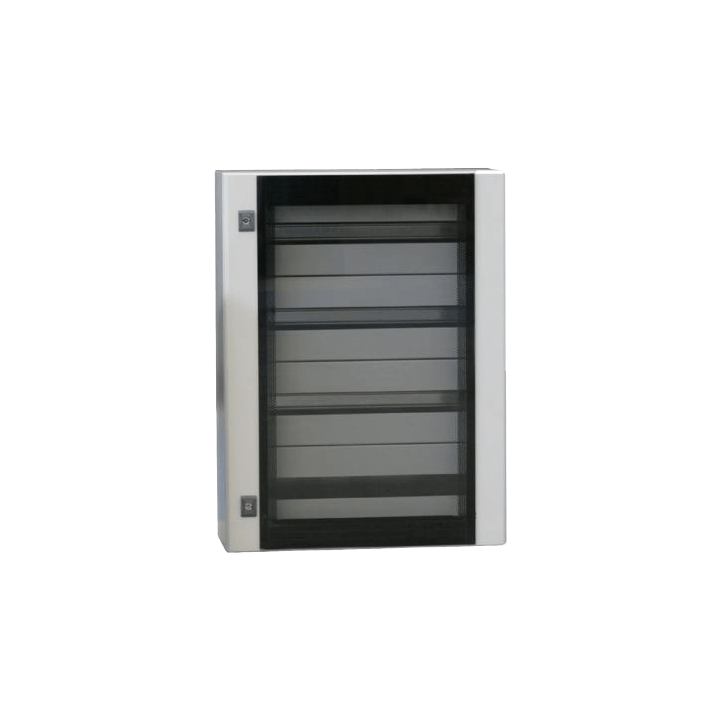 Cassa serie CE con porta in vetro serigrafato, grado di protezione IP 66. La struttura è realizzata in lamiera d'acciaio sp.15/10 verniciata RAL 7035 bucciato. Il pannello di cablaggio è in lamiera d’acciaio sp. 20/10 zincato. La porta è reversibile con 2 chiusure a box, verniciata RAL 7035 bucciato con guarnizione in colata continua. L’apertura della porta è protetta da una lastra di vetro di sicurezza serigrafato e fumè. Grado di resistenza all'urto secondo IEC EN 62208: IK09. Disegni tecnici scaricabili dal portale CADENAS.