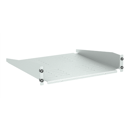 Realizzato in lamiera verniciata RAL 7035, spessore 15/10. Ingombro 2 unità. Fissaggio solo anteriore. Massimo carico statico 25kg.